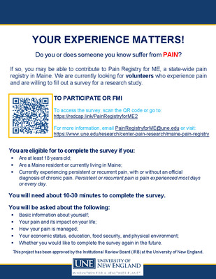 Information sheet for potential participants in UNE project Pain Registry for ME 2. Including: "Chronic pain is a serious public health problem but little is known about how pain affects Mainers. We plan to establish a pain registry through this study. This registry will collect information from Maine adults who experience recurrent and frequent pain. It is estimated that one...Read More